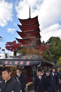 次はフェリーで日本三景の一つ宮島へ向かいました。フェリーからは瀬戸内海に立つ朱色の鳥居が徐々に近づいていく様子が見えました。宮島に到着後、鳥居のすぐ近くで学級ごとに記念撮影を行いました。その後は宮島のガイドさんの説明を聞きながら厳島神社や五重塔などの見学をしました。